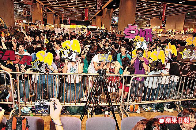 蔡卓妍和吳尊昨日現身灣仔會展為《武俠梁祝》漫畫寫真集舉行簽名會,兩人的魅力吸引300多名fans圍觀,將舞台附近迫得水洩不通。早前曾傳出緋聞的兩人,昨日不但未有表現尷尬,反而不停打情罵俏。