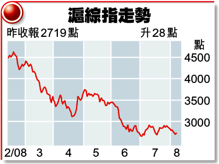 油價跌至近期新低,連跌兩日的內地股市昨跟隨外圍高開,金融和石化股領漲,惟午後獲利盤湧現,滬綜指全日僅升1.06%或28.62點,收報2719.36點。深圳樓市斷供潮傳聞再現,以內房股為主的深綜指欲彈乏力,收市微跌0.01%報790.64點。兩市成交額636.45億元(人民幣.下同)。