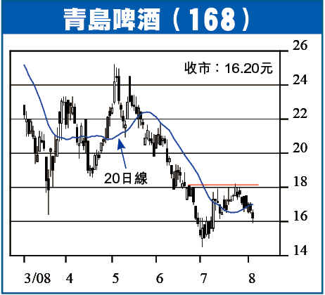 青啤周二低見15.92元,彈回16.20元收市。技術上,青啤仍偏弱,如不能盡快重返20日線17元水平之上企穩,短期將繼續尋底,現價值博率不大,候再試年內低位14.50至15元守穩,才考慮輕注低吸。