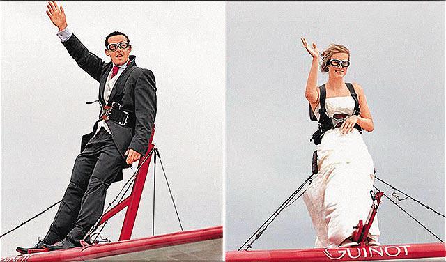 這對敢死新人,男的是24歲健身教練麥克沃爾特斯,女的是23歲郵務人員霍奇森。他倆前天穿着禮服和婚紗,戴上護目鏡,各自站在雙翼機機頂,飛入雲端,在站在另一機頂的牧師前,高聲交換山盟海誓。過程以揚聲器廣播,由地上的嘉賓一起見證。