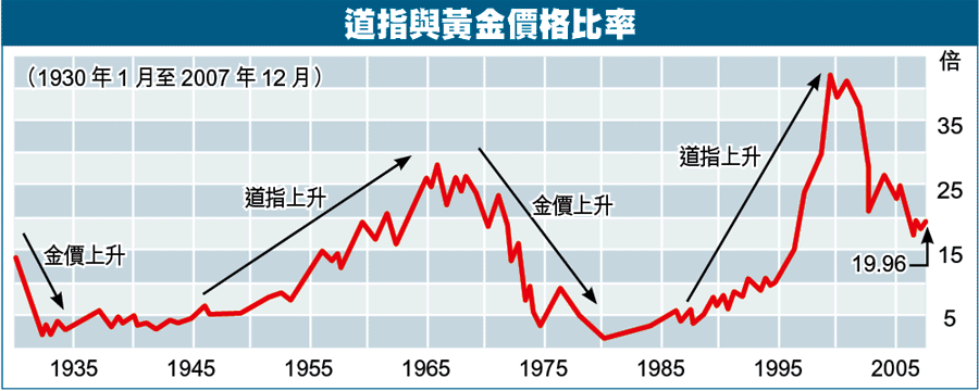附圖是金價與美股自1930年至今的走勢對照圖,圖中可見,黃金大升浪時,往往是股市低潮期,兩者大致呈長期相反走勢,因此假如這次真是商品大熊市來臨,則股市便可能快將擺脫熊市了!