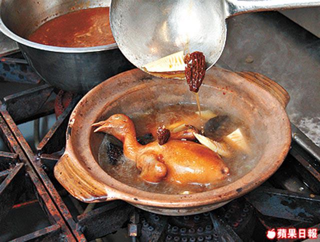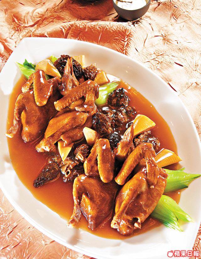 3.燒熱鑊爆香薑、蒜茸,下冬笋及羊肚菌炒香,注入雞湯及羊肚菌浸水,再下鹽、糖及乳鴿,滾起後調細火,冚蓋燜30分鐘即可。