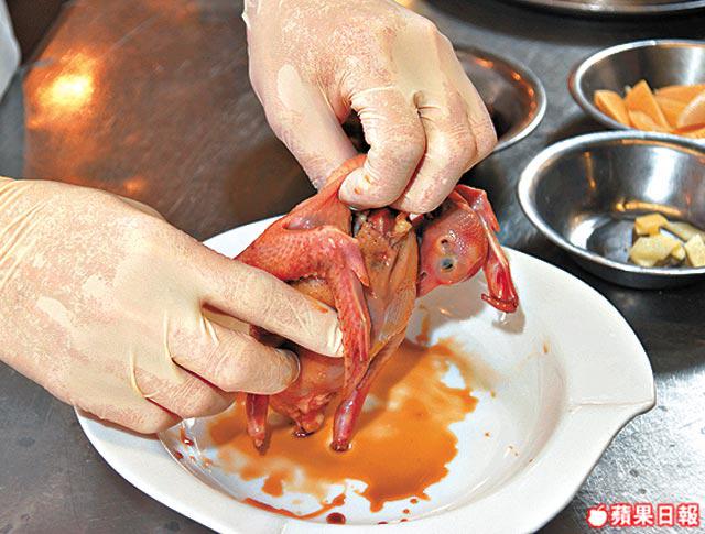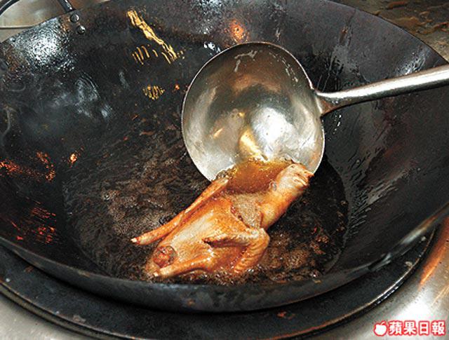 2.乳鴿以生抽捽勻上色,燒滾油至220℃,下乳鴿炸至金黃色,瀝亁油備用。
