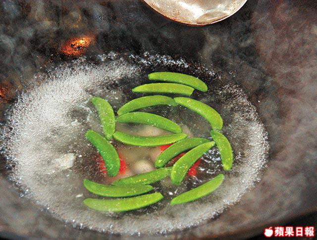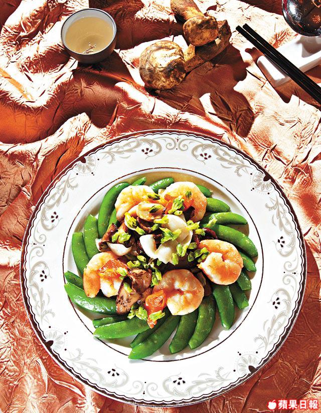 4.燒熱鑊爆香蒜茸,將海中蝦、蜜豆及鮮百合回鑊炒勻,再下牛肝菌,加入鹽、糖及生粉水埋芡,最後下夜香花兜勻上碟。