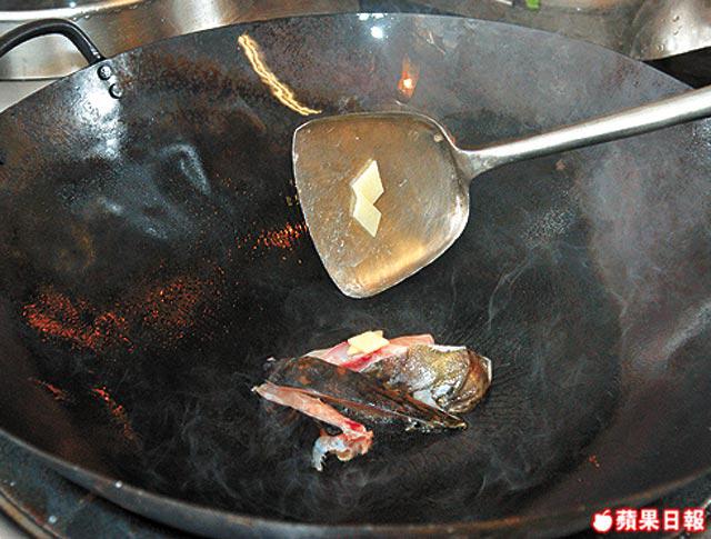 2.燒熱白鑊下薑片,煎香魚頭,老人頭菌回鑊炒勻。