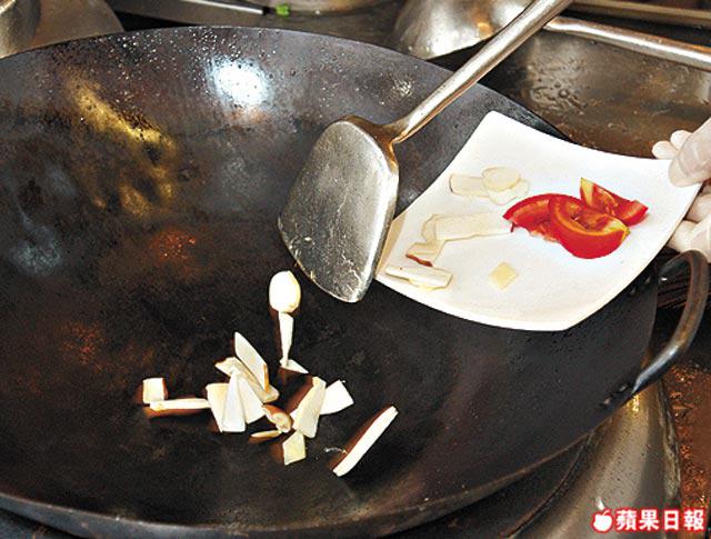1.牛肝菌洗淨切片,以蒜茸炒香備用。