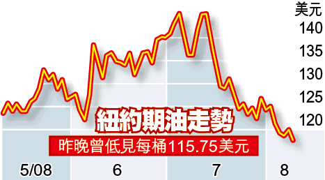 紐約9月期油昨最多跌4.27美元或3.56%,見每桶115.75美元。倫敦布蘭特期油亦底見113.55美元,跌4.31美元。
