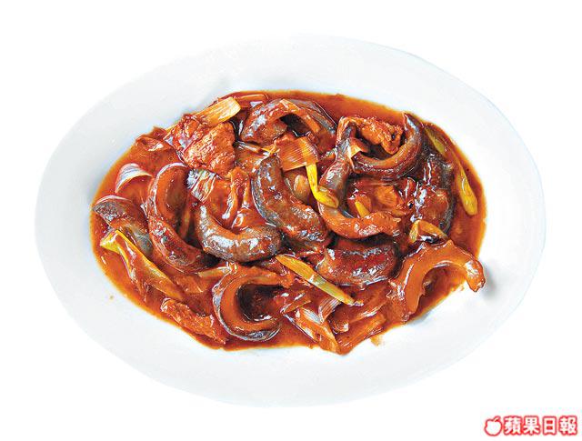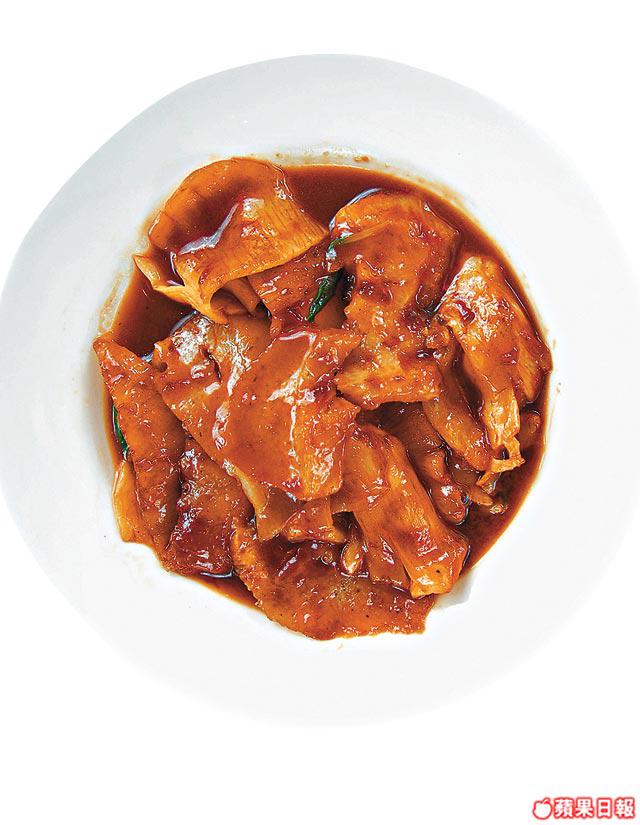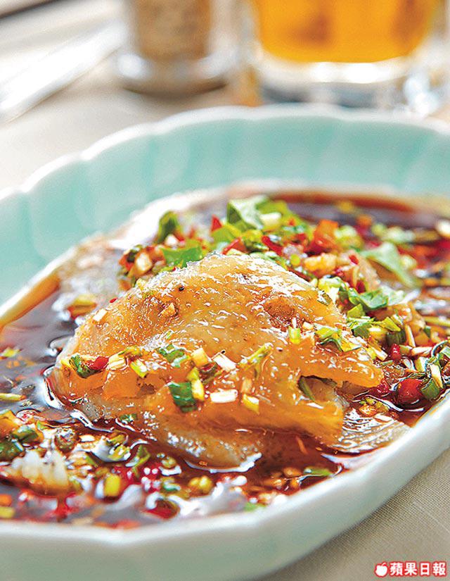 另一間「夜上海」則愛以海參切片,而且有較少見的凉拌方式處理,外觀似紅油抄手,許師傅笑說︰「這道菜用的是白禿。發起前先將參燒過去石灰味,發時用水煮沸歷時4至5日。而凉拌做法最重要是秘製酸辣汁,主要是由醋、生抽、豆瓣醬、秘製辣油和葱花等混合而成。」有點似配白切肉的汁,而白禿切片後外觀似西柚皮或豬皮,夏天作前菜十分醒胃,會令原來不吃海參的人改觀。