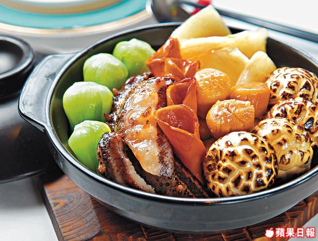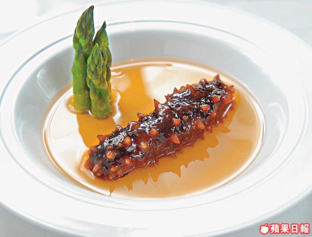 海參分幾種,最普通營養價值也相對低是豬婆參,俗稱大石參;身上有橫紋的禿參,分黑白兩禿;最矜貴的是遼參,身上有刺,中國遼寧出產,日本也有稱刺參,也分關東刺和關西刺,質素比中國的更佳。專食遼參的老饕必去「八月居」,提供完整一條條奉上。有道名為「蠔皇原支關東遼參」,樣子清新不似中菜,用上湯浸底,蘆笋伴碟,副主廚Eddie說︰「日本水質和風亁做法都好,未發前手指公大小,而遼參比起其他參爽口,所以揀日本遼參最佳。」要知道海參本身冇味,大家所食到的,其實是上湯和濃汁所給予的味道,Eddie說上湯也不離雞和火腿等,只要足料,毋須花巧已經足夠。