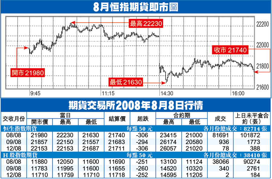 期指早段反彈至22230後即市見頂,再出現明顯沽壓,跌破本周初低位,尾市稍作反彈,以21740收市,跌306點,低水145點。