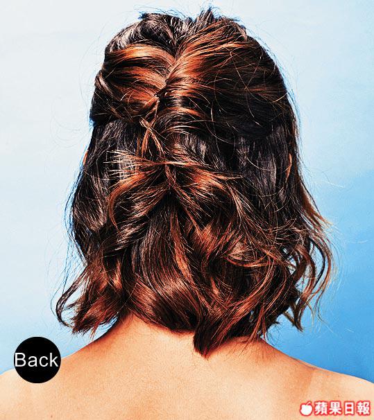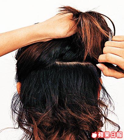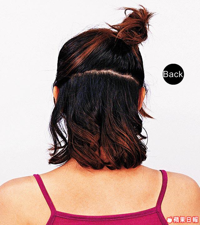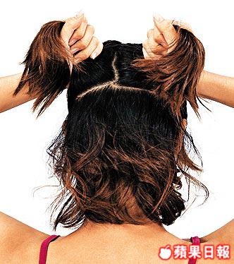 4.用手隨意把頂頭至腦後的頭髮束起,並把頭髮向內扭3圈,用髮夾穩固。