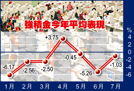 【本報訊】環球市況波動繼續拖累強積金表現,7月份整體強積金再錄得約1%跌幅,連續3個月錄得負回報,股票基金繼續成為下跌重災區,不過跌勢較6月份明顯收窄,其中中國和香港股票基金更逆市回升逾1%。 記者:李嘉麟