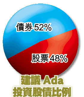 舉例說,債劵類別基金適用於降低整體投資組合的風險,而新興市場股票基金則用作博取高回報,當然股票所牽涉的風險會較債劵為高。根據簡單的股票與債劵分配定律,以100減去投資者的年齡,以Ada現年52歲計算,股票與債劵的比例應為48%及52%(圖2)。