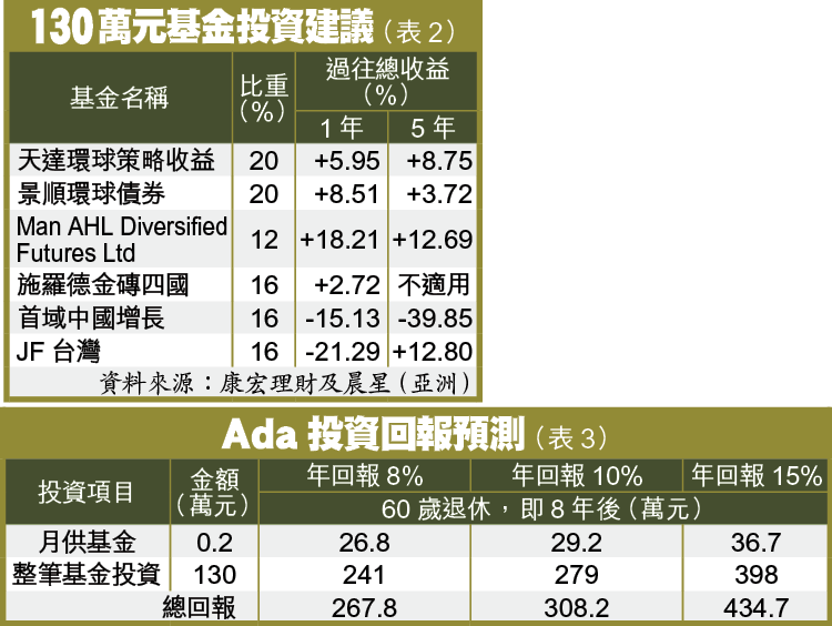 康宏資產管理董事陳子健建議,將原先的基金全部剔走,為Ada度身訂做的新組合共有6隻基金(表2),投資種類變得多元化,除有兩隻股票基金,亦加入低風險債券,增強組合防守性;另有期貨及期權基金,以追求絕對回報為目標,改善組合的風險回報比率。