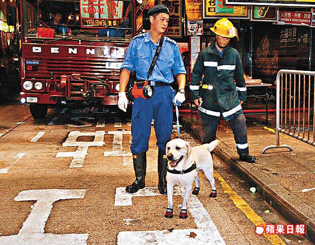 消防員昨傍晚帶同消防犬到肇事現場進一步調查(圖)。綽號「德仔」的消防犬聽命地跟隨消防員工作,由於犬隻嗅覺勝於人類萬倍,現場消息稱,相信憑着「德仔」的能耐,火災現場倘若有異於尋常的起火源頭,例如化學原料等,消防犬便能尋出端倪,加快消防及警方調查的進度。