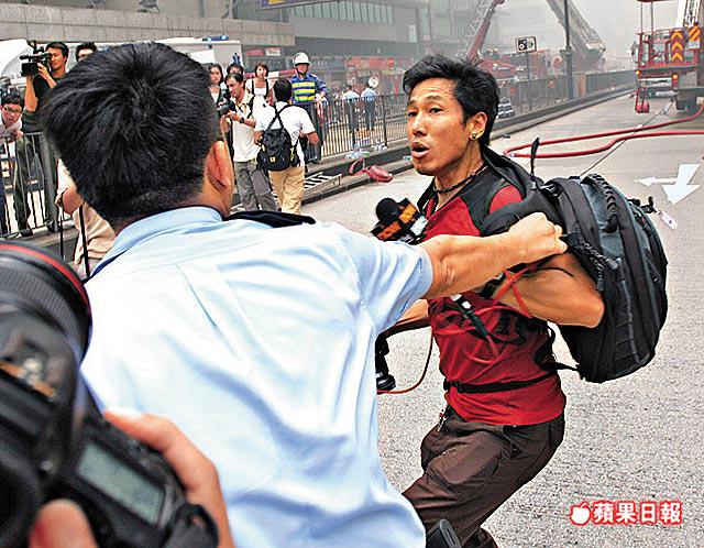 大火現場不同人有不同工作崗位,各為其主。努力向公眾報道新聞的新聞記者,與維持秩序的警員往往會有所衝突;昨日中午12時許,now電視台記者和一名警員發生爭執和輕微推撞(圖),本來事件已平息,但一名年約40歲的圍觀市民,卻向該名記者扯頭髮,結果被警員拘捕帶署。