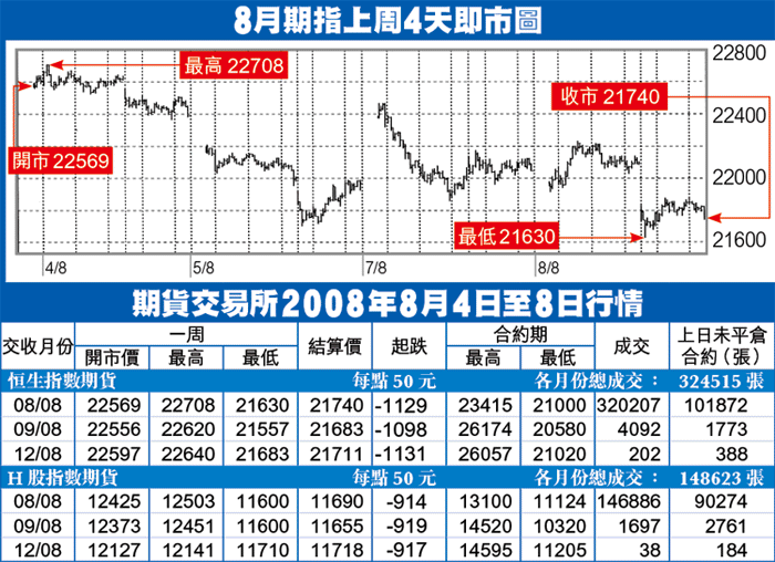 期指上周較為反覆,周二晚美股大升,周三受颱風影響停市一天,期指周四復市高開低收,周五更持續下試低位,以21740收市,全周累跌1129點,大低水145點。