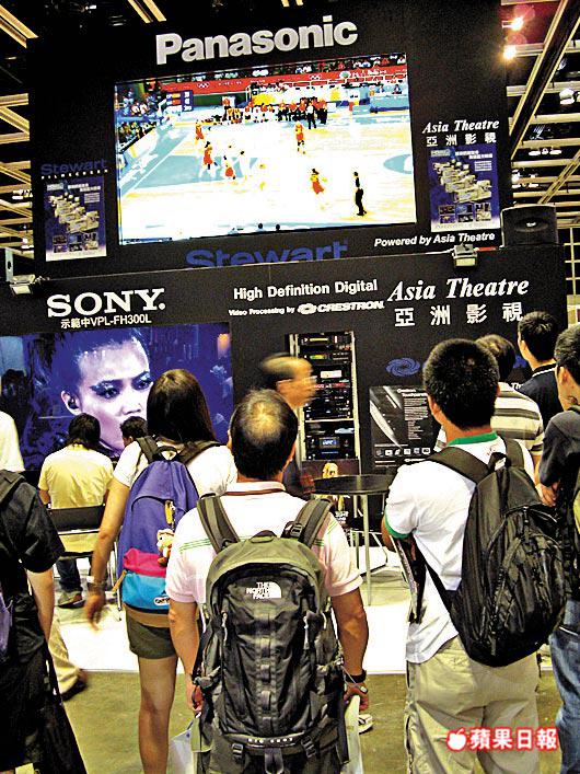 北京奧運前晚開幕,噚日正式比賽,吸引咗唔少市民買定薯片,留喺屋企舒舒服服攤喺度睇奧運,但係又有唔少人約埋朋友一齊睇,又叫又嗌有氣氛啲。小妹噚日去咗會展嘅高級視聽展,現場唔少參展商直播高清奧運(圖),有啲用投影機播放,220吋大畫面,吸引唔少人圍觀。小妹見啲運動員肌肉賁張,真係好震撼。直播中國女籃比賽嗰陣,中國隊入咗球,全場嘅人一齊歡呼,好鬼熱鬧,搞到視聽展變咗京奧嘉年華。