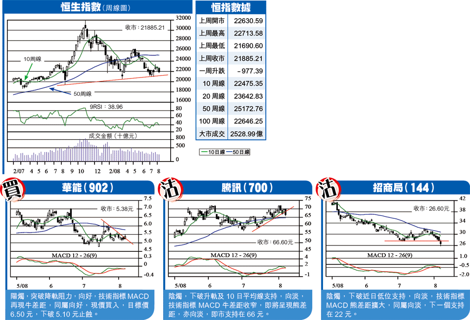 周線圖所見,連續兩個待變的陀螺、十字後,大市並未能見底回升,反而再呈向淡的陰燭,並收在10周線(22475)之下,走勢開始再度轉弱,一如預期般的反彈阻力重重,預期短期仍會是反覆偏軟。踏入業績期,繼本地大銀行公佈業績後,內銀股將會陸續公佈中期業績。值得留意的是,內銀股上半年業績雖然良好,但投資者開始擔心下半年,或者是09年的業績,是典型的熊市心態,在這樣的市況下,反彈實在不易。