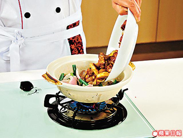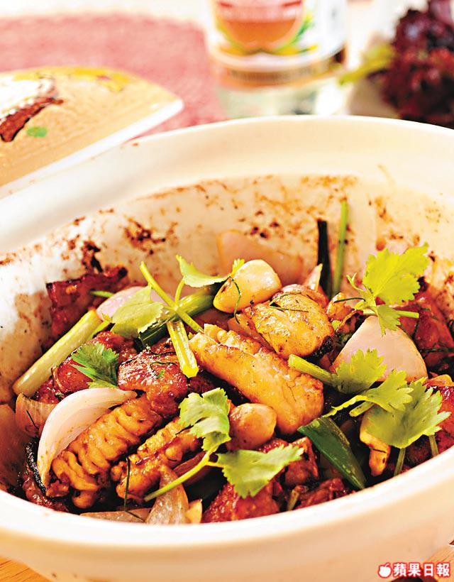 4.燒熱砂鍋加少少油,爆香沙薑、葱及紫洋葱炒勻,加雞件、白鱔球及芹菜炒一炒,再放檸檬葉絲及芫荽,冚蓋煮1分鐘,最後將米酒淋在煲蓋邊即成!