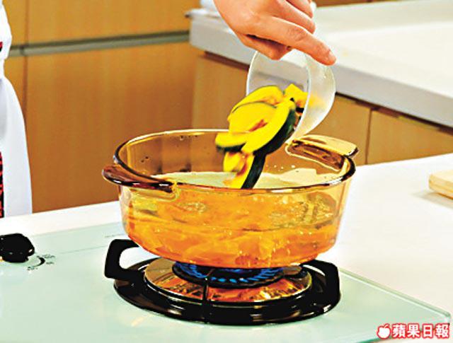2.將紅蘿蔔、南瓜、番茄、薑米放入滾水裏面,冚蓋用中火煲45分鐘。