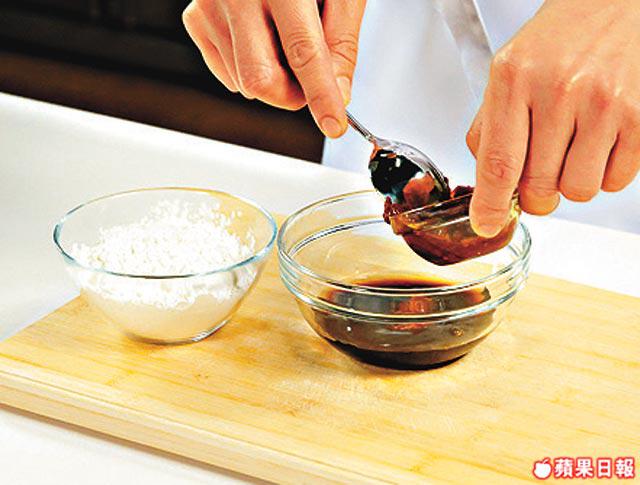 1.將水、萬字醬油、豆瓣醬及粘米粉放入碗內搓成漿狀備用。