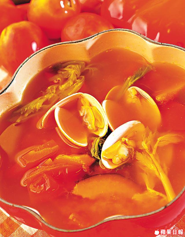 花蛤500克、日本南瓜/紅蘿蔔各120克、西芹葉/番茄各100克、薑米10克、日本清酒80克;