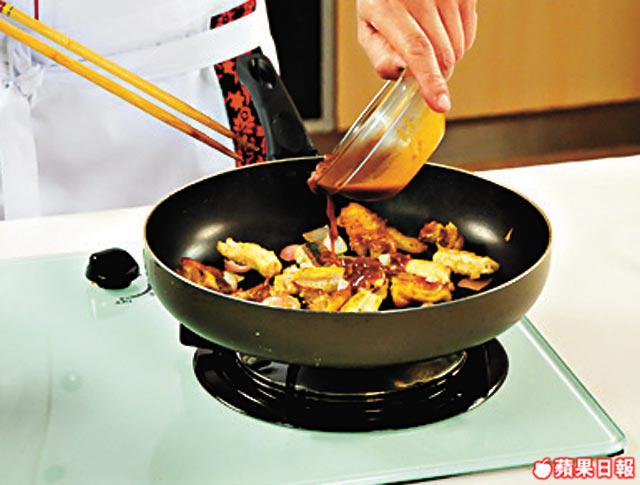 3.大火燒熱鑊,放入雞件後轉中火煎到兩邊金黃色,加鱔球煎熟,再放亁葱兜勻,淋上啫啫醬炒勻備用。