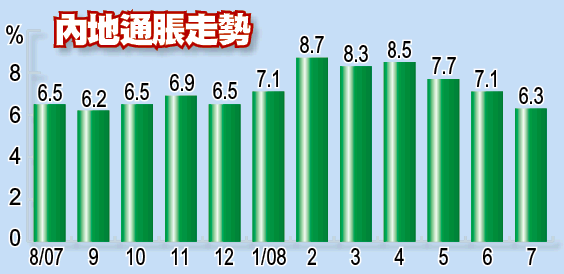 【本報訊】國家統計局公佈,7月份內地居民消費價格指數(CPI),較去年同期上升6.3%,除了低於路透社之前進行調查的中位數6.5%外,亦是自去年10月以來的10個月新低,並且連續第3個月錄得下跌,反映通脹形勢的控制初步見效。不過經濟分析師認為,7月份數據回落,雖令當局暫緩即時加息的必要,但中國通脹壓力仍大,亦不排除CPI稍後反彈的可能。