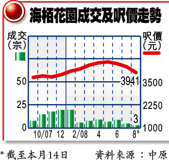中原地產區域營業經理余志文表示,海栢花園本月3宗成交中,全屬200餘萬元上車盤。其中,3座高層C室,530方呎,以207萬元易手,呎價3906元。4座高層C室,同屬530方呎,以205萬元售出,呎價3868元。他指,同類單位於今年初高峯期曾以220萬元成交,現時造價回落約6%。
