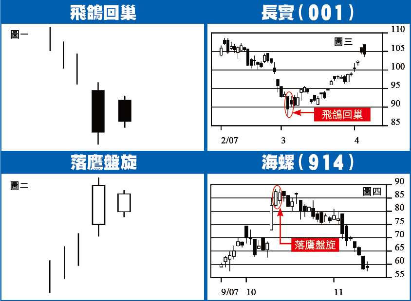 早前介紹陰陽燭主要轉向形態時,曾談過低位身懷六甲(BullishHarami)和高位身懷六甲(BearishHarami),前者利好,後者利淡。今日介紹的一對次級轉向形態,分別是飛鴿回巢(HomingPigeon)和落鷹盤旋(DescendingHawk),形狀與身懷六甲很相似,還須小心辨別。