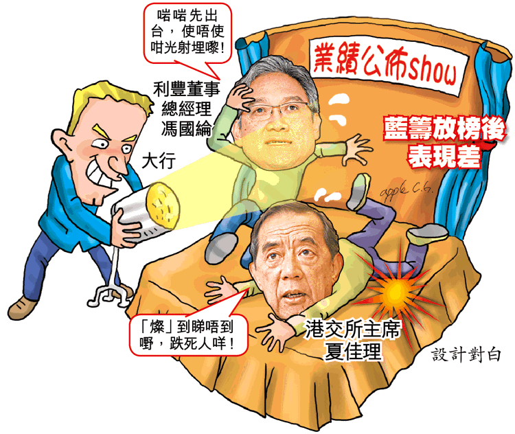 統計本月迄今,共有12間藍籌公佈業績,股價遜預期的東亞(023)、國泰(293)及港交所(388)自然捱沽,惟較意外是大部份符合預期的,放榜後股價皆反高潮下跌。例如前日收市後公佈中期業績的利豐(494)及騰訊(700),昨齊逆市下滑。