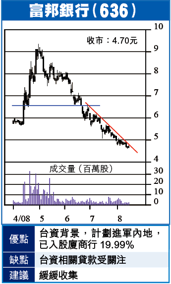 富邦現價4.70元,如下半年業績與上半年相同,PE約11倍,息率4厘,P/B1.31倍,由高位回落50%,已有留意價值,未來仍將再炒概念,但既已洩氣,亦不易隨即重振雄風,只宜候低收集。