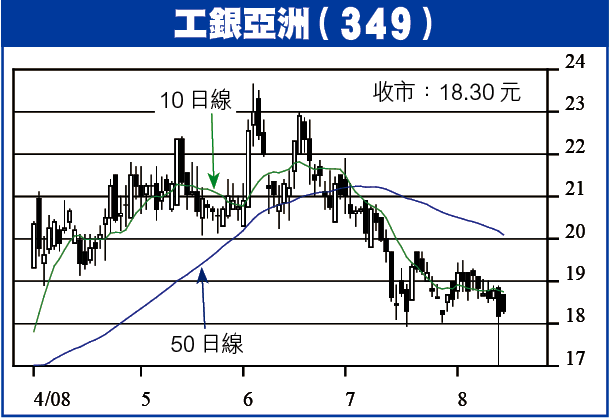 工銀亞洲(349)08年度中期盈利9.16億元,較07年同期增長27%,勝巿場預期。上半年已再就結構投資工具增加減值,整體減值覆蓋率已達約82%,目前SIV資產只剩下不足800萬美元,相關風險已不高。08年度預期PE約12倍,預計息率約5厘,防守力強,可在18.00元附近吸納,目標20.00元,止蝕17.20元。