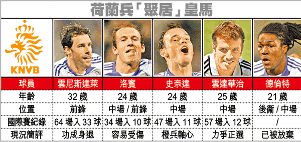 雲尼斯達萊無論是在皇馬或荷蘭國家隊,俱是近年正選,其上陣64場攻入33球的國際賽紀錄,入球率極高。不過,年屆32歲的雲佬已宣佈退出,友賽俄羅斯一役將不會看到他。洛賓在左路威脅極大,亦是前教練尹巴士頓的愛將,惜洛賓最大弱點是容易受傷,甚至未有踢足全場的體力。