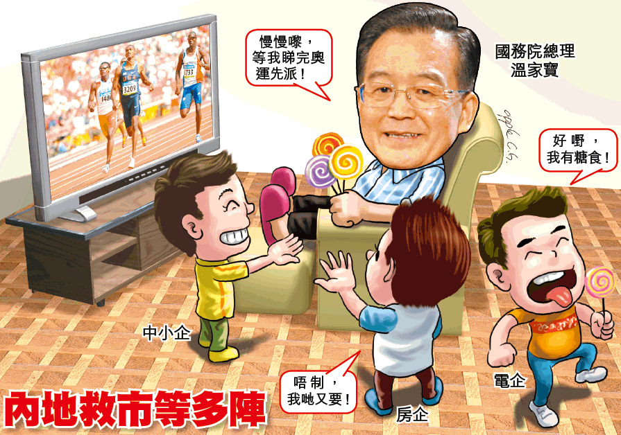 為救中小企及保就業,財政部昨日表示,今年預算安排2億元為中小企提供融資擔保,並加大勞動密集型中小企貼息至200億元。財政部及人行又宣佈,金融機構對個人新發放的小額擔保貸款金額最高額度由2萬元提高至5萬元,對資本密集型中小企小額擔保最高額度,由100萬元提高至200萬元,利率可按人行公佈的貸款利率基準上浮3厘。發改委則救電企,昨宣佈今日起上調上網電價。