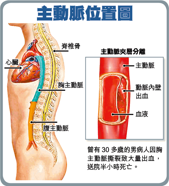 急症科專科醫生張展鵬表示,主動脈分離是指連接心臟的主動脈血管中,內壁出現撕裂分離的情況,當血液流經撕裂處時,會有部份血液積聚,並在夾層中形成血塊,由於主動脈會供血致全身器官,故患者會出現胸痛、背痛等病症,「就好似俾人撕裂咁痛」,情況類似腎臟生石時出現的背痛。