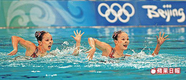 中國雙胞胎組合蔣文文、蔣婷婷昨日在雙人技術自選韻律泳預賽中,以48.084分暫居第4。 路透社