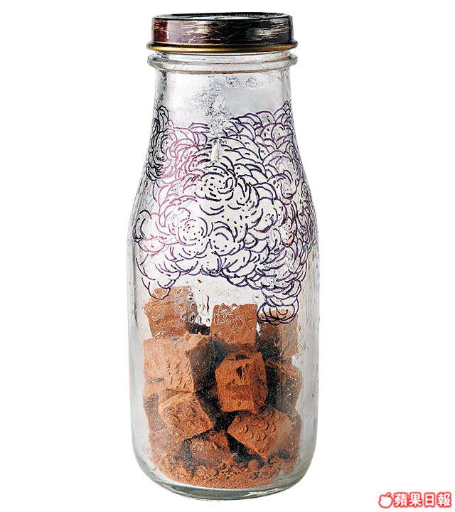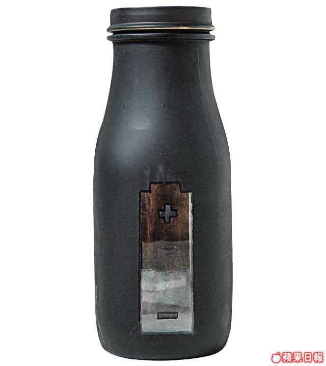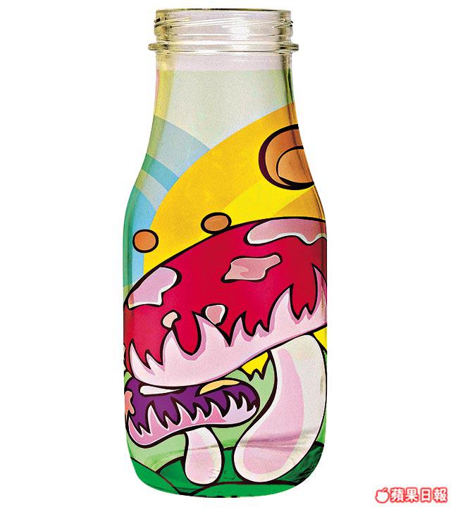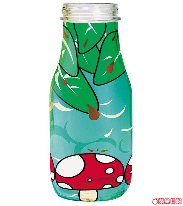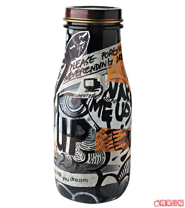 「Goointhebottle──自我沉醉於凍咖啡的世界,感受濃情每刻。」蘑菇圖案是阿詩的象徵,樽面則掃上白色油彩,令大小不一的黑色蘑菇隱藏於樽內,表達她自我沉醉的心情。