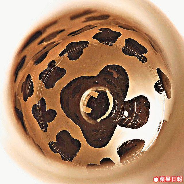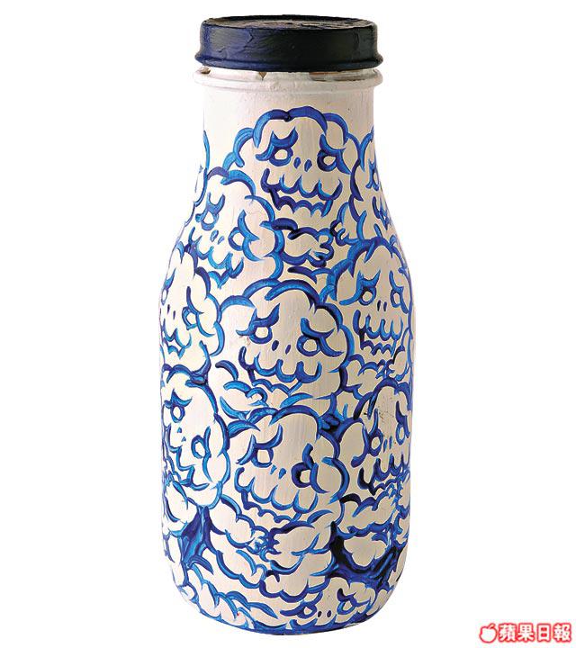 「聯想起凍咖啡,我認為要有冰凉的視覺享受,所以揀選了這種藍色。起初以羽毛作主題,最後覺得孔雀毛的圖案最特別。繪畫玻璃樽很難上色和易脫落,所以我參照了鼻煙壺的做法,於樽內上色,用塑膠彩畫了半日才成功。」