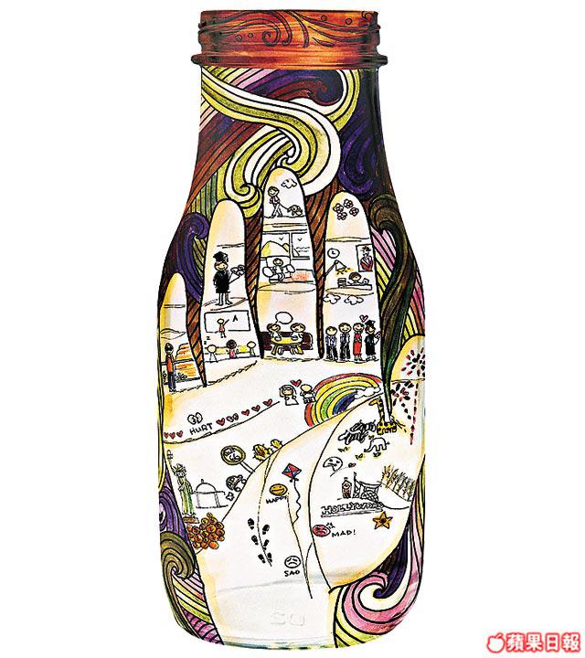 空瓶子的用途令我想起將願望字條放進瓶內隨大海飄流的電影橋段,明白毫無意思但感覺浪漫。這年頭,要分享體驗、表達所想,寫張字條掉入海已經老土又過時,瓶子的創作空間既大又獨特,星巴克找來一眾創作人設計出55個意念不同、訊息不一的玻璃樽作網上展覽就是好例子,繽紛的色彩和創意的構思足叫大家賞心悅目,為炎夏消暑。