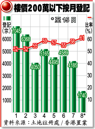 香港置業統計本月首15日的土地註冊處資料,共錄得2839宗二手住宅註冊登記,樓價200萬元內的細價樓,佔61%共1740宗,比例為11個月新高,反映細價樓在淡市中仍受追捧。該行預期,年底前細價樓仍會支撐大市,成交比例維持60%以上。