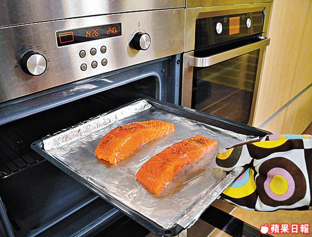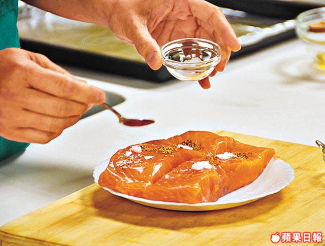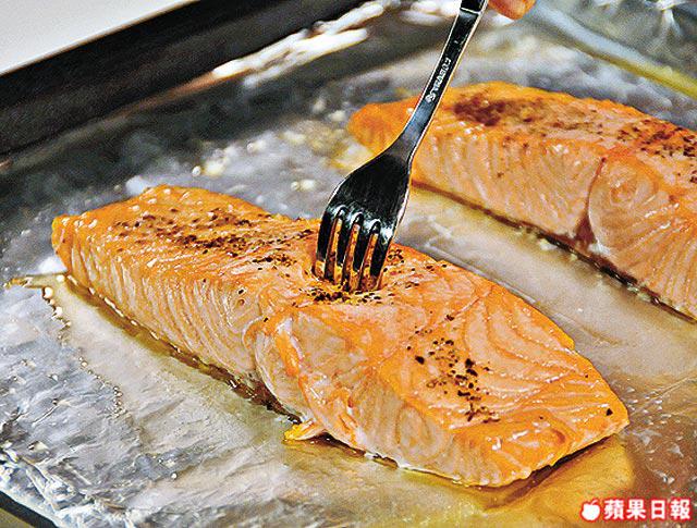 三文魚柳不宜焗過熟,用叉輕輕拮得入魚身,即表示熟透。