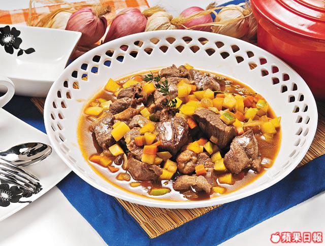 1.羊肉切一吋大丁粒,加鹽、胡椒粉及麵粉在大碗內拌勻。