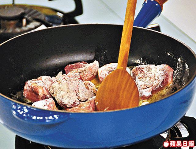 2.開中火下牛油,加羊肉煮至半熟,煮至肉身呈啡色,即盛起備用。