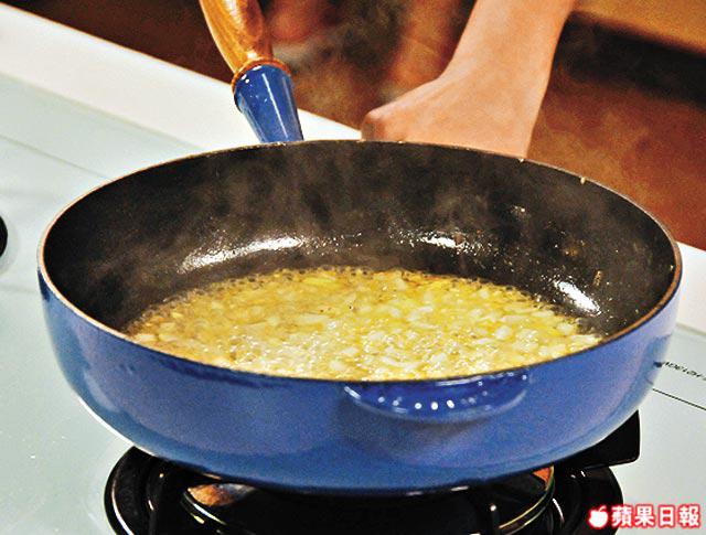 1.中火燒熱鍋下牛油,再落橄欖油煮熱。