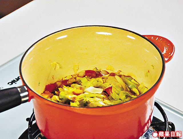 1.中火燒熱鑊落油,加入洋葱粒及椰菜絲炒1分鐘至略為軟身,轉細火加入水、番茄粒、蘋果醋、黃糖及鹽拌勻煮滾。