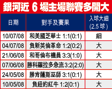 「讓球」銀河讓平/半,可取上盤,除了博他們「反底」外,亦因為艾連拿有料,以及銀河於家得寶主場一向有穩定的發揮。另外,銀河主場多入球,補1注入球「大」。文:吾中