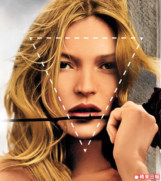 醜與美只有一線之差,其貌不揚的KateMoss擁有被稱為倒三角黃金比例之臉形。其五官距離分佈剛好,秘密是她面上的倒三角,而此三角形更與Madonna的心形非常相似,就連包包臉的你也可仿效。