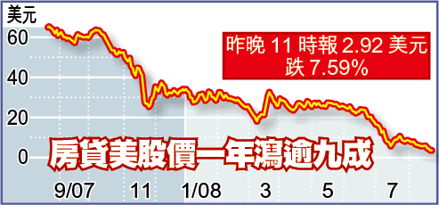 「兩房」股份一直深受中小型銀行歡迎,股價卻在過去12個月瀉逾九成,令銀行損失慘重。瑞信利率策略師杰賽認為,美國中小型銀行可能是「兩房」股價重挫的最大輸家,若財長保爾森選擇犧牲「兩房」股東的利益,等於對中小型銀行「踩多一腳」,隨時引發銀行倒閉潮。